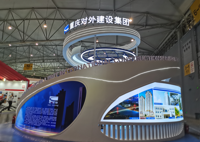 外建集团作为重庆市属唯一外型向国有企业参展,展厅面积约110平方米,整体突出“融入共建一带一路”和“立足重庆、助力双城、着眼世界”概念,着重展示外建集团国内外工程项目和助力成渝地区双城经济圈建设成果,重点体现跨国企业风范和建筑行业标杆形象。