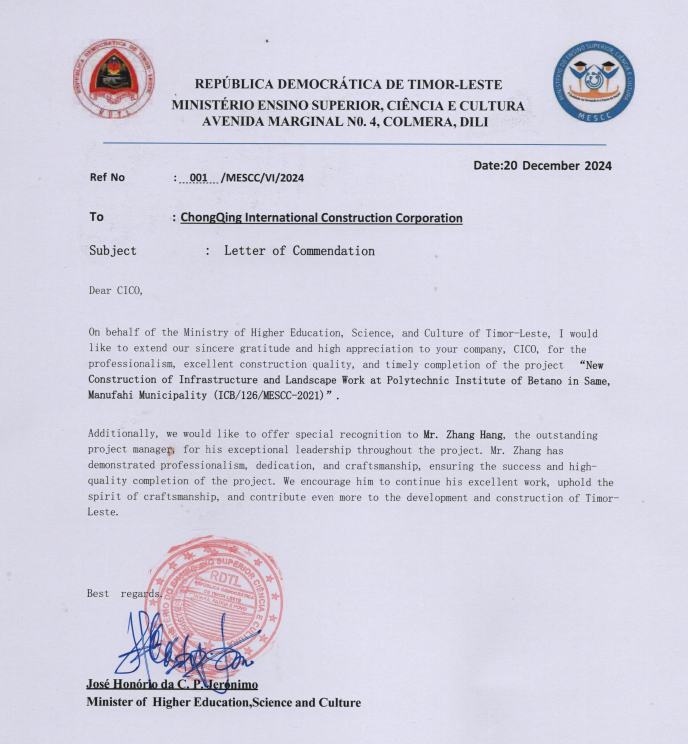 近日,重庆对外建设集团收到由东帝汶高等教育科技文化部部长亲自签发的表扬信,来信高度赞扬集团在贝塔罗农业技术学院项目中展现出的专业素养、施工质量和履约能力。