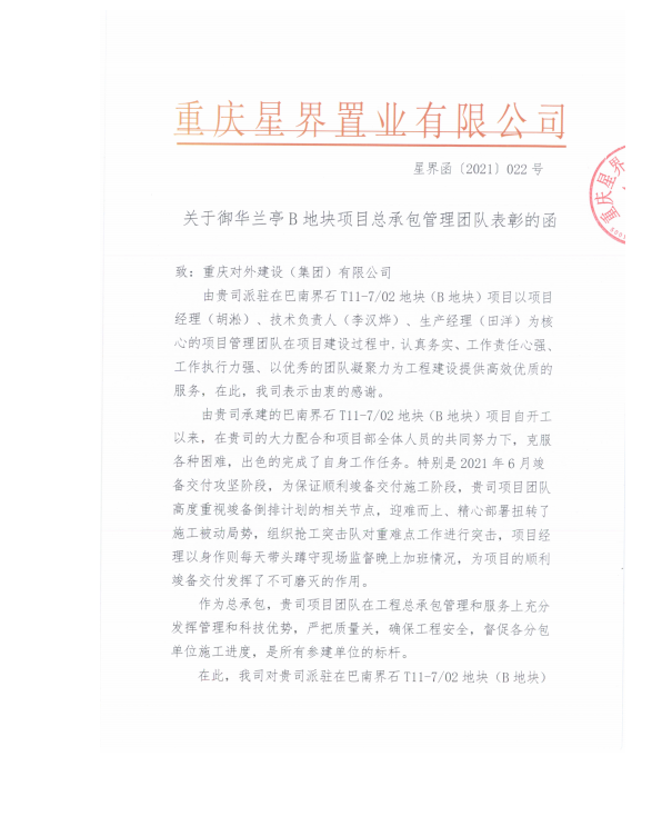 近日,重庆星界置业有限公司向外建集团发出两封表彰函,函中对该总承包管理团队及团队负责人胡淞的敬业精神、施工能力等给与了高度评价和认可。...